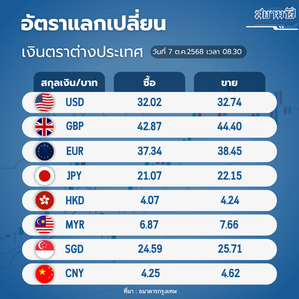 วันที่ 7 ต.ค.68 ผู้สื่อข่าวรายงานอัตราแลกเปลี่ยนเงินตราต่างประเทศ ประจำวันที่ 7 ต.ค.68 ว่า อัตราแลกเปลี่ยนเงินบาทเป็นสกุลเงินตราต่างๆ ตามเวลา 08.30 น. (ตามตารางประกอบข้างล่าง) โดยเงินดอลลาร์สหรัฐรับซื้อ 32.02 บาท ต่อดอลลาร์สหรัฐ ขายออก 32.74 บาทต่อดอลลาร์สหรัฐ
