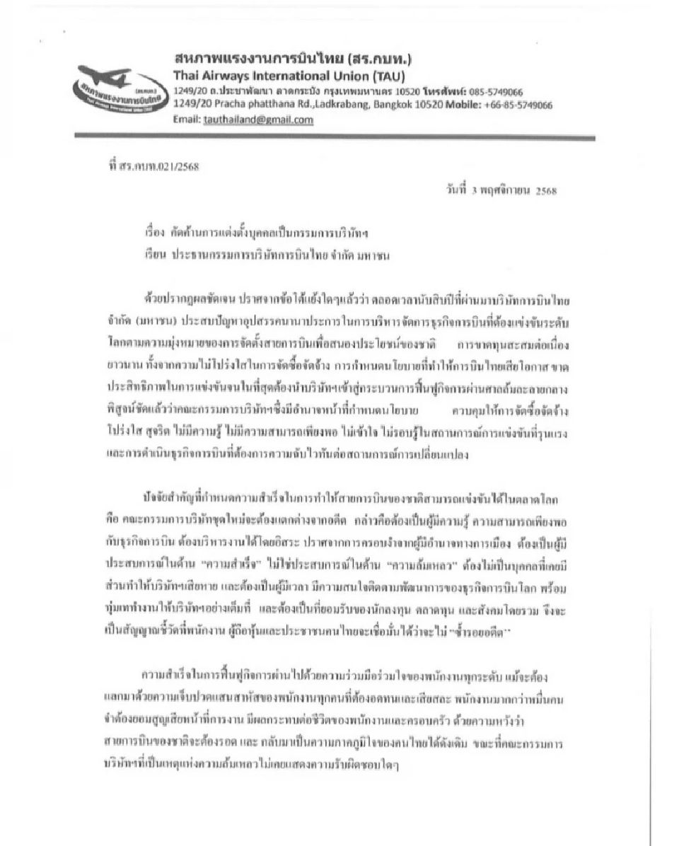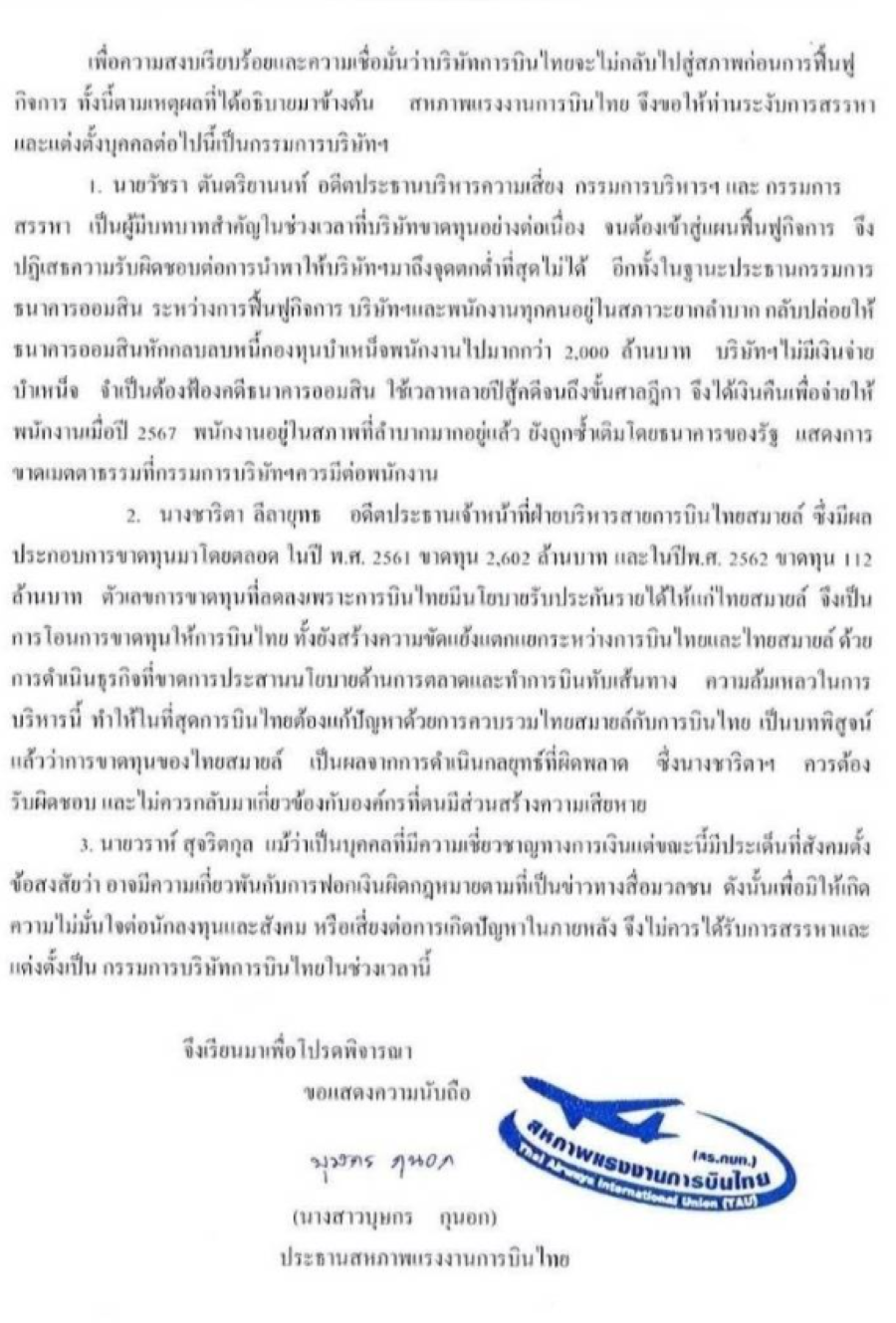 จึงขอให้ระงับการสรรหาและแต่งตั้งบุคคลต่อไปนี้เป็นกรรมการบริษัทฯ คนแรกคือ นายวัชรา ตันตริยานนท์ อดีตประธานบริหารความเสี่ยง กรรมการบริหารฯ และกรรมการสรรหา ระบุว่า เป็นผู้มีบทบาทสําคัญในช่วงเวลาที่บริษัทขาดทุนอย่างต่อเนื่อง จนต้องเข้าสู่แผนฟื้นฟูกิจการ และระหว่างการฟื้นฟูกิจการปล่อยให้ธนาคารออมสินหักกลบลบหนี้กองทุนบําเหน็จพนักงานไปมากกว่า 2,000 ล้านบาท ,2. นางชาริตา ลีลายุทธ อดีตประธานเจ้าหน้าที่ฝ่ายบริหารสายการบินไทยสมายล์ ระบุว่า ผลประกอบการขาดทุนมาโดยตลอด ระหว่างการบินไทยและไทยสมายล์ ด้วยการดําเนินธุรกิจที่ขาดการประสานนโยบายด้านการตลาดและทําการบินทับเส้นทาง และ 3. นายวราห์ สุจริตกุล ระบุว่า แม้เป็นบุคคลที่มีความเชี่ยวชาญทางการเงิน แต่ขณะนี้มีประเด็นที่สังคมตั้งข้อสงสัยว่าอาจมีความเกี่ยวพันกับการฟอกเงินผิดกฎหมาย เพื่อมิให้เกิดความไม่มั่นใจต่อนักลงทุนและสังคม หรือเสี่ยงต่อการเกิดปัญหาในภายหลัง จึงไม่ควรได้รับการสรรหาและแต่งตั้งเป็นกรรมการบริษัทการบินไทยในช่วงเวลานี้