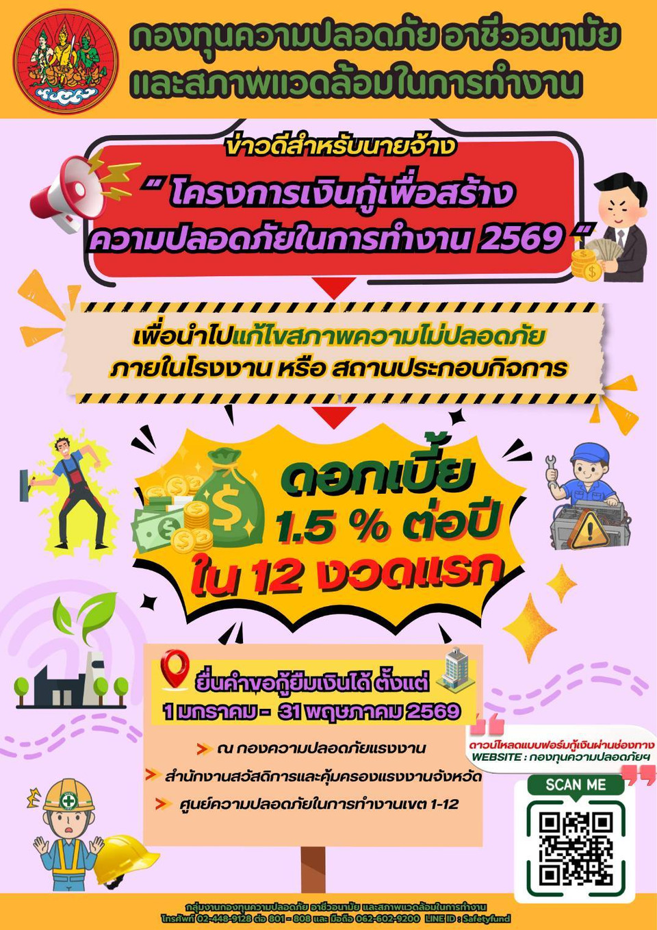 สำหรับนายจ้างที่สถานประกอบกิจการได้รับความเสียหายหรืออุปกรณ์ไม่มีความปลอดภัย สามารถกู้เงินจากกองทุนความปลอดภัย อาชีวอนามัย และสภาพแวดล้อมในการทำงาน เพื่อนำไปปรับปรุงซ่อมแซมอุปกรณ์หรือเครื่องจักรเพื่อให้เกิดความปลอดภัยในการทำงาน ดอกเบี้ยเพียง 1.5 % ต่อปี ใน 12 งวดแรก โดยสามารถยื่นคำขอกู้ยืมเงินได้ ตั้งแต่ 1 มกราคม – 31 พฤษภาคม 2569