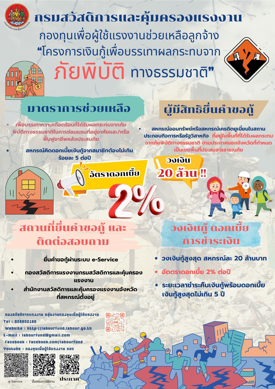 อธิบดี กสร. กล่าวต่อว่า ขอประชาสัมพันธ์ไปยังสถานประกอบกิจการ ว่า กสร. ได้จัดสรร “วงเงินกู้ดอกเบื้อต่ำเพื่อบรรเทาผลกระทบจากภัยพิบัติทางธรรมชาติ” โดยให้กู้ผ่านสหกรณ์ออมทรัพย์หรือสหกรณ์เครดิตยูเนี่ยนในสถานประกอบกิจการและรัฐวิสาหกิจสามารถขอกู้เงินจากกองทุนเพื่อผู้ใช้แรงงานนำไปปล่อยกู้ให้ลูกจ้างใช้ซ่อมแซมที่อยู่อาศัยหรือฟื้นฟูอาชีพที่ได้ในอัตราดอกเบี้ย 2 % ต่อปี