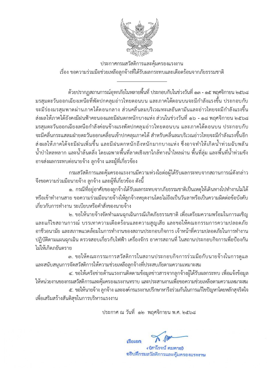 เรือเอก สาโรจน์ คมคาย อธิบดีกรมสวัสดิการและคุ้มครองแรงงาน (กสร.) เปิดเผยว่า จากสถานการณ์อุทกภัยที่เกิดขึ้นในหลายจังหวัดภาคใต้ นางสาวตรีนุช เทียนทอง รัฐมนตรีว่าการกระทรวงแรงงาน ได้แสดงความห่วงใยต่อนายจ้างและลูกจ้างที่ได้รับผลกระทบ และได้สั่งการให้ กสร. ออกมาตราการเพื่อช่วยเหลือลูกจ้าง นายจ้าง ผมจึงได้สั่งการไปยังหน่วยงานในสังกัดกรมสวัสดิการและคุ้มครองแรงงานทุกพื้นที่ที่ได้รับผลกระทบจากอุทกภัย โดยขอความร่วมมือให้นายจ้างผ่อนผันให้ลูกจ้างที่ที่อยู่อาศัยถูกน้ำท่วม ไม่สามารถเดินทางไปทำงานได้ หรือมาทำงานล่าช้า สามารถหยุดงานได้โดยไม่ถือเป็นวันลา ตามประกาศกรมสวัสดิการและคุ้มครองแรงงาน เรื่อง ขอความร่วมมือช่วยเหลือลูกจ้างที่ได้รับผลกระทบและเดือดร้อนจากภัยธรรมชาติ ลงวันที่ 12 พฤศจิกายน พ.ศ. 2568 พร้อมทั้งเน้นย้ำให้นายจ้างจัดทำแผนฉุกเฉิน ตรวจสอบความปลอดภัยของอาคาร เครื่องจักร และระบบไฟฟ้า เพื่อป้องกันความเสี่ยงในช่วงเกิดภัยพิบัติ ทั้งนี้ ขอให้นายจ้าง ลูกจ้าง และองค์กรแรงงานร่วมกันปรึกษาหารือและแก้ไขสถานการณ์ด้วยความสุจริตใจ เพื่อให้สามารถผ่านพ้นวิกฤตอุทกภัยทางภาคใต้ครั้งนี้ไปได้ร่วมกันอย่างปลอดภัย