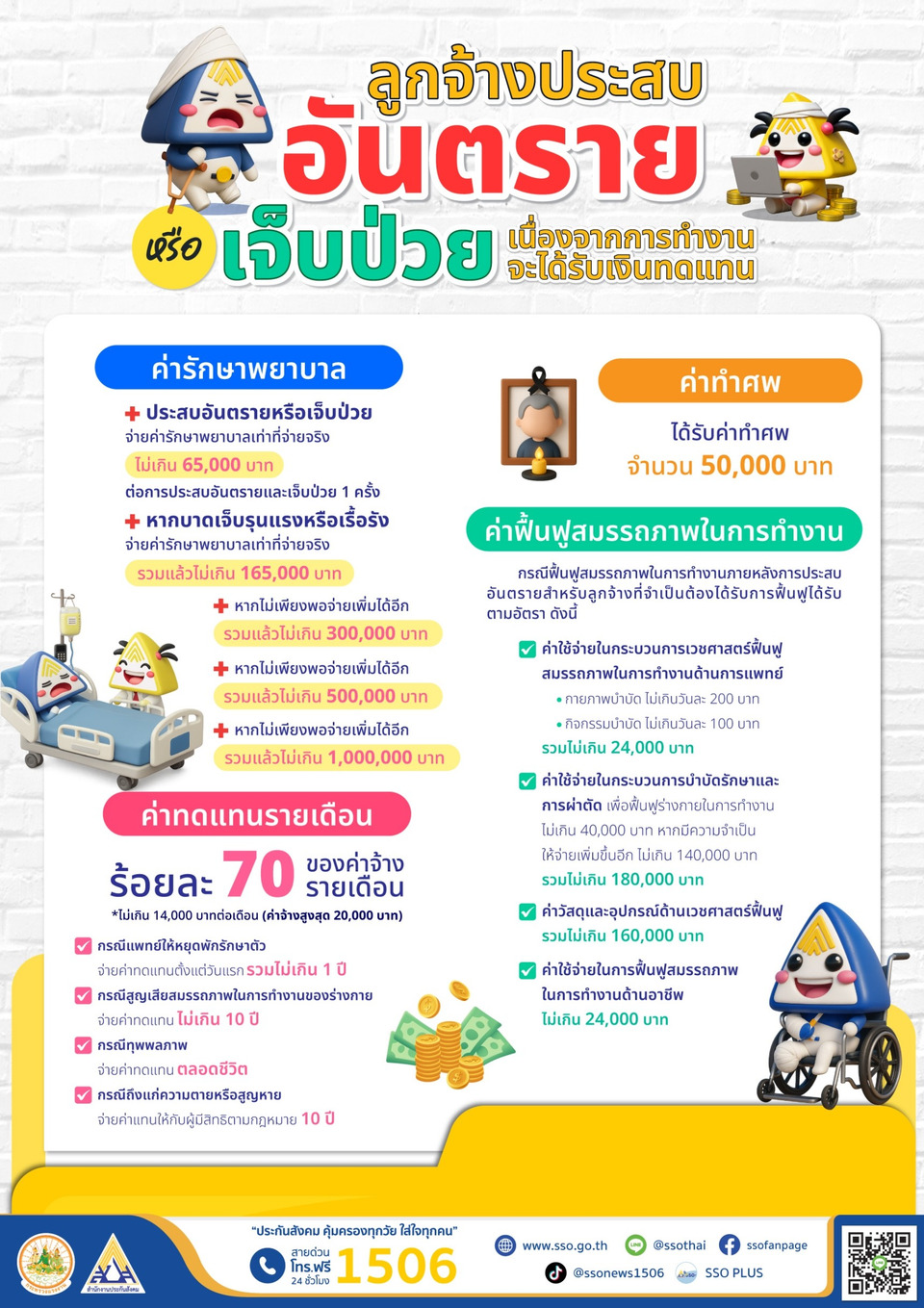 สำนักงานประกันสังคม จัดทำ อินโฟกราฟิก เรื่อง "เมื่อลูกจ้างประสบ อันตราย หรือเจ็บป่วย เนื่องจากการทำงาน จะได้รับเงินทดแทน" โดยมีรายละเอียดดังนี้