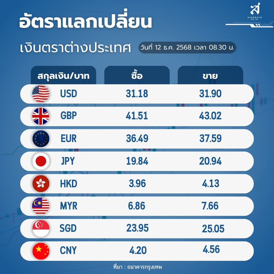 วันที่ 12 ธ.ค.68 ผู้สื่อข่าวรายงานอัตราแลกเปลี่ยนเงินตราต่างประเทศ ประจำวันที่ 12 ธ.ค.68 ว่า อัตราแลกเปลี่ยนเงินบาทเป็นสกุลเงินตราต่างๆ ตามเวลา 08.30 น. (ตามตารางประกอบข้างล่าง) โดยเงินดอลลาร์สหรัฐรับซื้อ 31.18 บาท ต่อดอลลาร์สหรัฐ ขายออก 31.90 บาทต่อดอลลาร์สหรัฐ