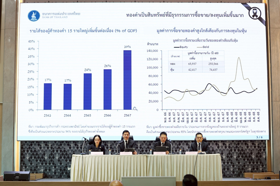 ขณะที่ปัจจุบันธุรกรรมทองคำผ่านแพลตฟอร์มออนไลน์ของผู้ค้ารายใหญ่ 15 ราย และมีขนาดใหญ่มาก 2-3 ราย โดยในปี 2567 มีมูลค่าสูงถึง 39% ของ GDP และคาดว่าจะเกิน 50% ในปีหน้า นอกจากนี้ มูลค่าการซื้อขายทองคำเฉลี่ยอยู่ที่ 65,000 ล้านบาทต่อวัน ซึ่งสูงกว่าการซื้อขายหุ้นในตลาดหลักทรัพย์ฯ ที่มีมูลค่า 42,000 ล้านบาทต่อวัน และในวันที่ราคาทองผันผวน ปริมาณการเทรดเคยพุ่งสูงถึง 255,000 ล้านบาทต่อวัน ส่งผลกระทบโดยตรงต่อเสถียรภาพค่าเงินบาท