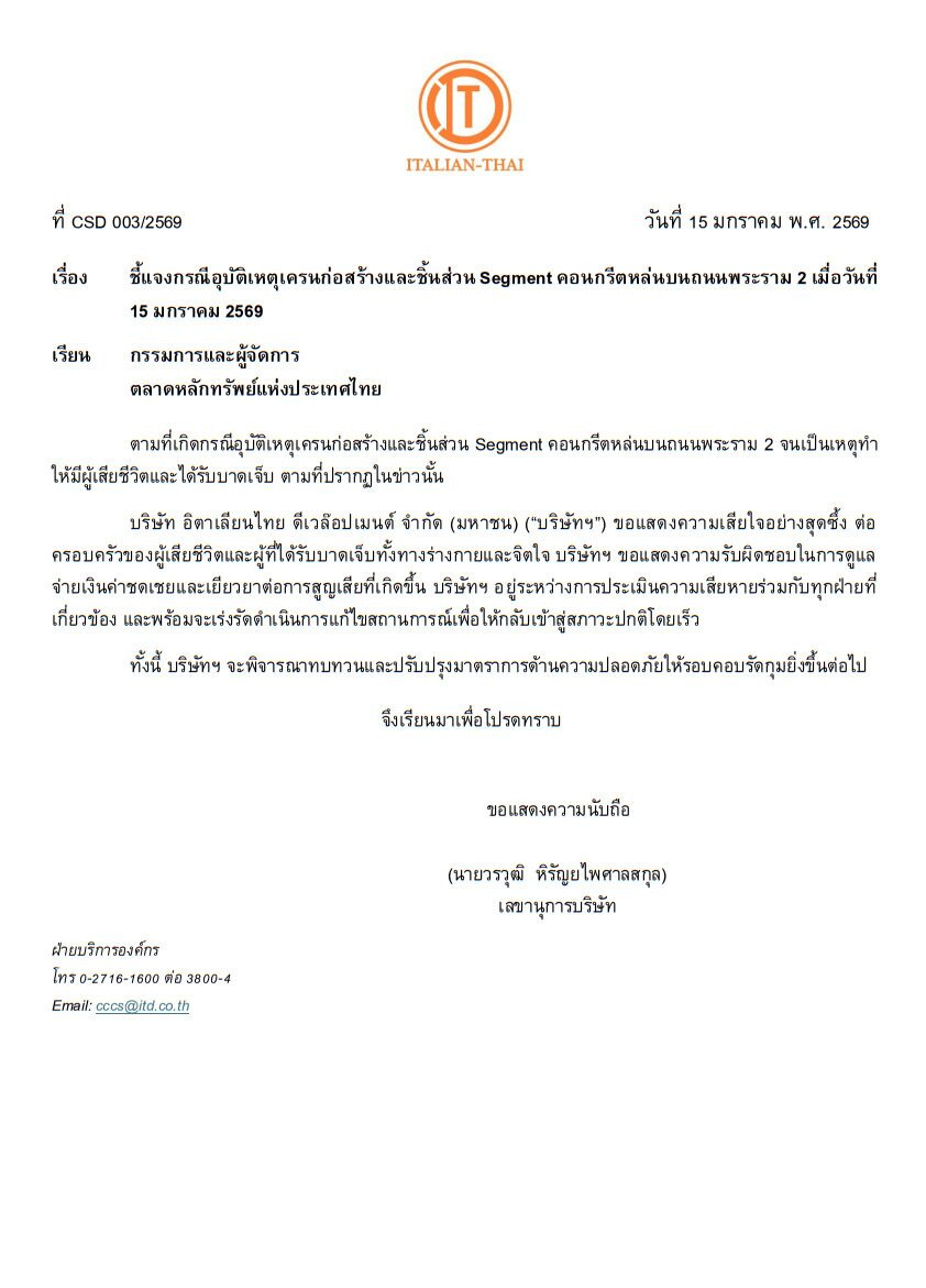 เมื่อวันที่ 15 ม.ค. 2569 บริษัท อิตาเลียนไทย ดีเวล๊อปเมนต์ จำกัด (มหาชน) ได้ส่งหนังสือถึงกรรมการและผู้จัดการ ตลาดหลักทรัพย์แห่งประเทศไทย(ตลท.) เรื่อง ชี้แจงกรณีอุบัติเหตุเครนก่อสร้างและชิ้นส่วน Segment คอนกรีตหล่นบนถนนพระราม 2 เมื่อวันที่ 15 ม.ค. 2569
