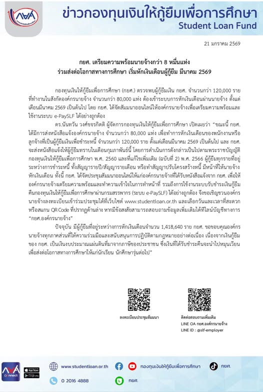 วันที่ 21 ม.ค. 2569 นางสาวนันทวัน วงศ์ขจรกิตติ ผู้จัดการกองทุนเงินให้กู้ยืมเพื่อการศึกษา (กยศ.) เปิดเผยว่า ขณะนี้ กยศ. ได้มีการส่งหนังสือแจ้งองค์กรนายจ้าง จำนวนกว่า 80,000 แห่ง เพื่อทำการหักเงินเดือนของพนักงานหรือลูกจ้างที่เป็นผู้กู้ยืมเงินเพื่อชำระหนี้ จำนวนกว่า 120,000 ราย ตั้งแต่เดือน มี.ค. 2569 เป็นต้นไป และ กยศ. จะส่งหนังสือแจ้งให้ผู้กู้ยืมทราบในเดือน ก.พ. นี้