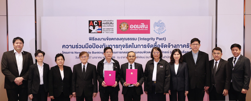 ซึ่งเป็นความร่วมมือป้องกันการทุจริตในการจัดซื้อจัดจ้างภาครัฐ ตามยุทธศาสตร์ในการป้องกันและปราบปรามการทุจริตคอร์รัปชันอย่างยั่งยืนของรัฐบาล ที่มีนโยบายส่งเสริมการบริหารงานที่มีธรรมาภิบาล และการป้องกันปราบปรามการทุจริตและประพฤติมิชอบในภาครัฐที่สร้างความไม่เป็นธรรมและเหลื่อมล้ำในสังคม สำหรับโครงการที่มีวงเงินจัดซื้อจัดจ้างตั้งแต่ 1,000 ล้านบาทขึ้นไป โดยสอดคล้องกับการดำเนินการด้วยหลักธรรมาภิบาลของธนาคาร ที่ให้ความสำคัญในการบริหารจัดการงบประมาณ และทรัพยากรของธนาคาร ด้วยความรอบคอบ โปร่งใส และเกิดประโยชน์สูงสุด มีกระบวนการทำงานที่มีความสุจริต เที่ยงธรรม ตรวจสอบได้ในทุกขั้นตอน และเปิดโอกาสให้ภาคเอกชนเข้าแข่งขันอย่างเท่าเทียม โดยมี นางสาวศิริพร เลิศสัตยสุกใส นายณัทธร โพธิแพทย์ รองผู้อำนวยการธนาคารออมสิน พร้อมด้วย นางสาวสิรินันท์ จิรดิลก กรรมการผู้จัดการ บริษัท จีเอสบี ไอที แมเนจเม้นท์ จำกัด ในฐานะกรรมการโครงการ และนายกิตติเดช ฉันทังกูล ผู้อำนวยการองค์กรต่อต้านคอร์รัปชัน (ประเทศไทย) ร่วมเป็นสักขีพยาน ณ อาคารออมสินพิพัฒน์ ธนาคารออมสิน สำนักงานใหญ่ เมื่อวันที่ 27 มกราคม 2569