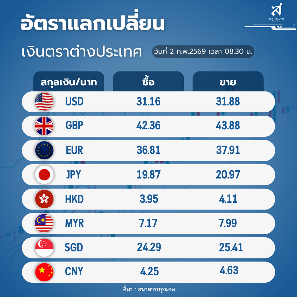 วันที่ 2 ก.พ.69 ผู้สื่อข่าวรายงานอัตราแลกเปลี่ยนเงินตราต่างประเทศ ประจำวันที่ 2 ก.พ.69 ว่า อัตราแลกเปลี่ยนเงินบาทเป็นสกุลเงินตราต่างๆ ตามเวลา 08.30 น. (ตามตารางประกอบข้างล่าง) โดยเงินดอลลาร์สหรัฐรับซื้อ 31.16 บาท ต่อดอลลาร์สหรัฐ ขายออก 31.88 บาทต่อดอลลาร์สหรัฐ