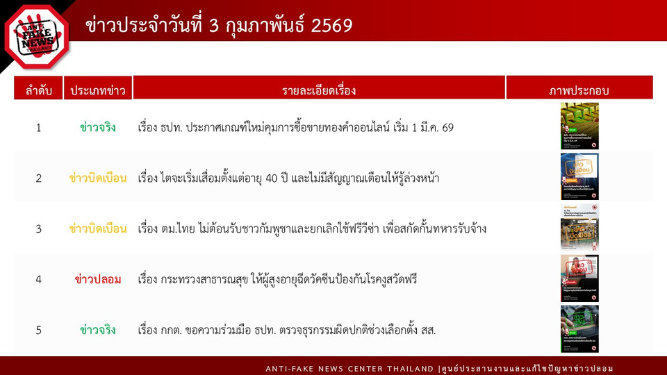 สำหรับอันดับ 1 เป็นข่าวจริง : เรื่อง “ธปท. ประกาศเกณฑ์ใหม่คุมการซื้อขายทองคำออนไลน์ เริ่ม 1 มี.ค. 69” กระทรวงดีอี ได้ประสานงานร่วมกับ ธนาคารแห่งประเทศไทย (ธปท.) ยืนยันเป็น “ข่าวจริง” ธปท. ได้กำหนดหลักเกณฑ์ใหม่เกี่ยวกับ “การซื้อขายทองคำในประเทศ” ผ่านระบบอิเล็กทรอนิกส์นอกตลาดสัญญาซื้อขายล่วงหน้า โดยจำกัดมูลค่าธุรกรรมที่ชำระเป็นเงินบาทไม่เกิน 50 ล้านบาท/วัน/ราย หากเกินกว่านี้ต้องยื่นขออนุญาตจาก ธปท.ล่วงหน้า
