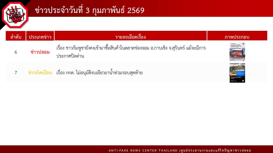 อันดับที่ 6 ข่าวปลอม เรื่อง ชาวกัมพูชายังคงเข้ามาซื้อสินค้าในตลาดช่องจอม อ.กาบเชิง จ.สุรินทร์ แม้จะมีการประกาศปิดด่าน