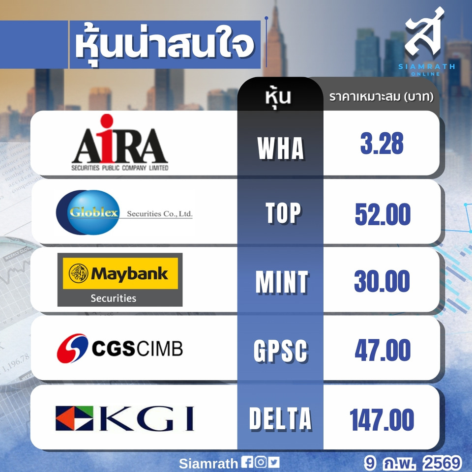 ข่าวเศรษฐกิจรู้ก่อนรวยก่อน ส่อง 5 หุ้น น่าสนใจ 09/02/69แชร์ข่าววันที่ 9 ก.พ.2569 ส่องกล้องมองตลาดหุ้นไทยตัวไหนน่าลงทุนประจำวันที่ 9 กุมภาพันธ์ 2569 โต๊ะเศรษฐกิจสยามรัฐอินไซด์ ข่าวแนะนำ"แบงก์ชาติ" เปิดรับสมัครทุนเรียนต่อปริญญาโท–เอก 3 สาขา ปั้นบุคลากรด้านเศรษฐกิจและการเงินข่าวเศรษฐกิจแบงก์ชาติเปิดรับสมัครทุนเรียนต่อปริญญาโท–เอก 3 สาขา เสริมกำลังคนด้านเศรษฐกิจ การเงิน และนโยบายรัฐติดตาม !ผลการเลือกตั้งสส.-ออกเสียงประชามติ อย่างไม่เป็นทางการได้ที่นี่ การเมืองทั่วไปสกลนครพลิกเกม! “กล้าธรรม” ปักธง 3 เขต เพื่อไทยแบ่ง 3 ภูมิใจไทยได้ 1 ช็อกครูดังไม่ผ่านข่าวภูมิภาคTOA x AssetWise หนุนวิ่งการกุศล AssetWise BEAUTY RUN 2026 ต่อเนื่องปีที่ 4 มอบรายได้ให้สถาบันมะเร็งแห่งชาติประชาสัมพันธ์Tags:ตลาดหุ้นราคาหุ้นราคาหุ้นวันนี้แชร์ข่าว