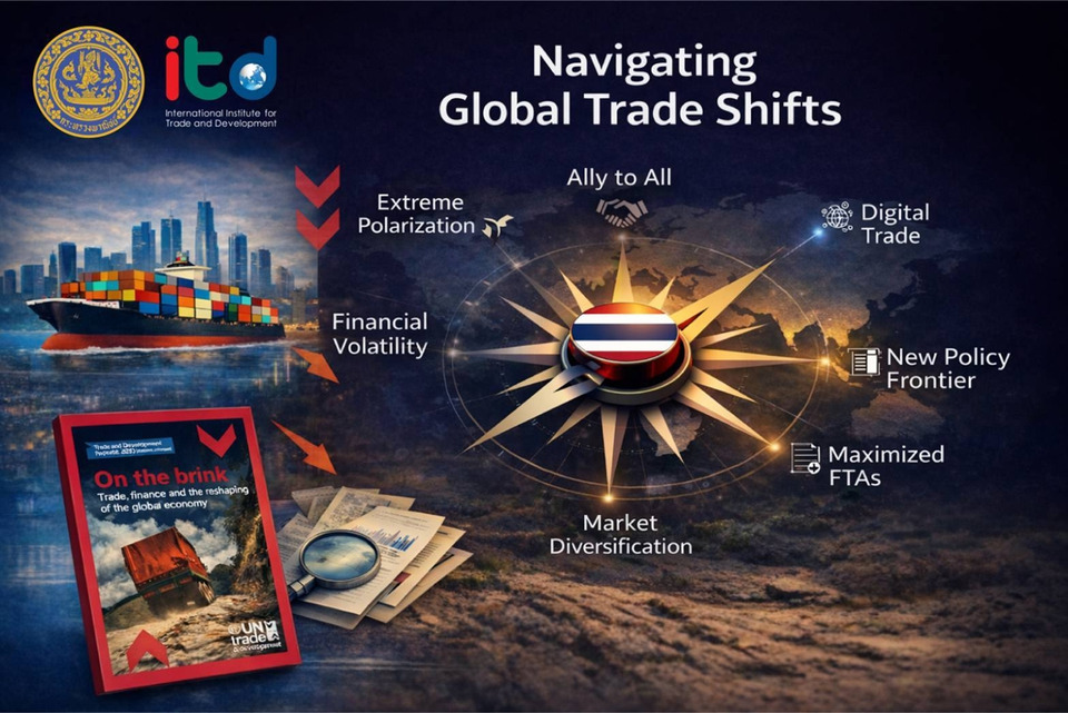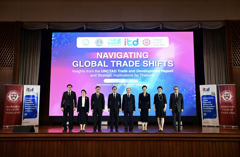 วันที่ 16 ก.พ.69 สถาบันระหว่างประเทศเพื่อการค้าและการพัฒนา (องค์การมหาชน) ITD ร่วมกับกระทรวงพาณิชย์ กระทรวงการต่างประเทศ UN Trade and Development (UNCTAD) และสมาคมนักเรียนเก่าฮาร์วาร์ดแห่งประเทศไทย จัดเวทีสัมมนาวิชาการนานาชาติหัวข้อ “Navigating Global Trade Shifts: Insights from the UNCTAD Trade and Development Report and Strategic Implications for Thailand” ณ ห้องวิเทศสโมสร กระทรวงการต่างประเทศ และผ่านระบบ Hybrid โดยมีผู้เข้าร่วมกว่า 150 คน จากภาครัฐ ภาคเอกชน สถาบันการศึกษา และองค์กรระหว่างประเทศ เพื่อร่วมกันวิเคราะห์ทิศทางเศรษฐกิจโลกจากรายงาน Trade and Development Report 2025 (TDR 2025) และกำหนดยุทธศาสตร์การค้าของไทยให้สอดรับกับบริบทโลกที่กำลังเปลี่ยนผ่านอย่างมีนัยสำคัญ