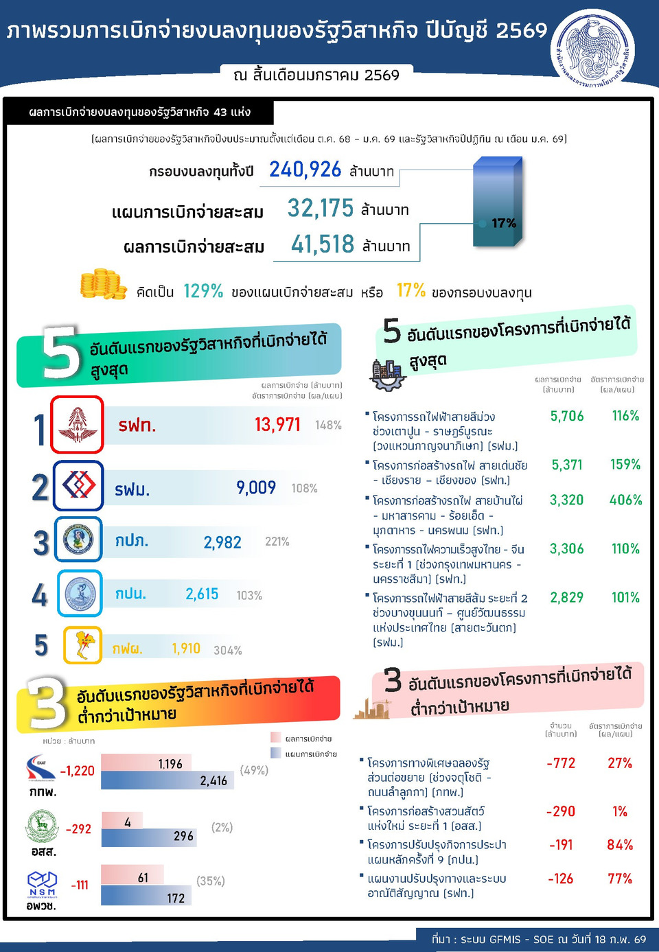 นายธิบดี วัฒนกุล ผู้อำนวยการสำนักงานคณะกรรมการนโยบายรัฐวิสาหกิจ (สคร.) เปิดเผยว่า การเบิกจ่ายงบลงทุนของรัฐวิสาหกิจที่อยู่ในการติดตามของสำนักงานคณะกรรมการนโยบายรัฐวิสาหกิจ (สคร.) อย่างใกล้ชิด จำนวน 43 แห่ง แบ่งออกเป็น 2 กลุ่ม ได้แก่ กลุ่มรัฐวิสาหกิจที่ใช้ปีบัญชีตามปีงบประมาณ (รัฐวิสาหกิจปีงบประมาณ) และกลุ่มรัฐวิสาหกิจที่ใช้ปีบัญชีตามปีปฏิทิน (รัฐวิสาหกิจปีปฏิทิน) โดยในปีบัญชี 2569 รัฐวิสาหกิจมีกรอบงบลงทุน จำนวน 240,926 ล้านบาท และมีผลการเบิกจ่ายสะสมจนถึงสิ้นเดือนมกราคม 2569 จำนวน 41,518 ล้านบาท หรือคิดเป็นร้อยละ 129 ของแผนการเบิกจ่ายสะสม ประกอบด้วยการเบิกจ่าย งบลงทุนของรัฐวิสาหกิจปีงบประมาณ (ตั้งแต่เดือนตุลาคม 2568 - เดือนมกราคม 2569) 34 แห่ง จำนวน 34,974 ล้านบาท หรือคิดเป็นร้อยละ 119 ของแผนการเบิกจ่ายสะสม และรัฐวิสาหกิจปีปฏิทิน (เดือนมกราคม 2569) 9 แห่ง จำนวน 6,544 ล้านบาท หรือคิดเป็นร้อยละ 233 ของแผนการเบิกจ่ายสะสม