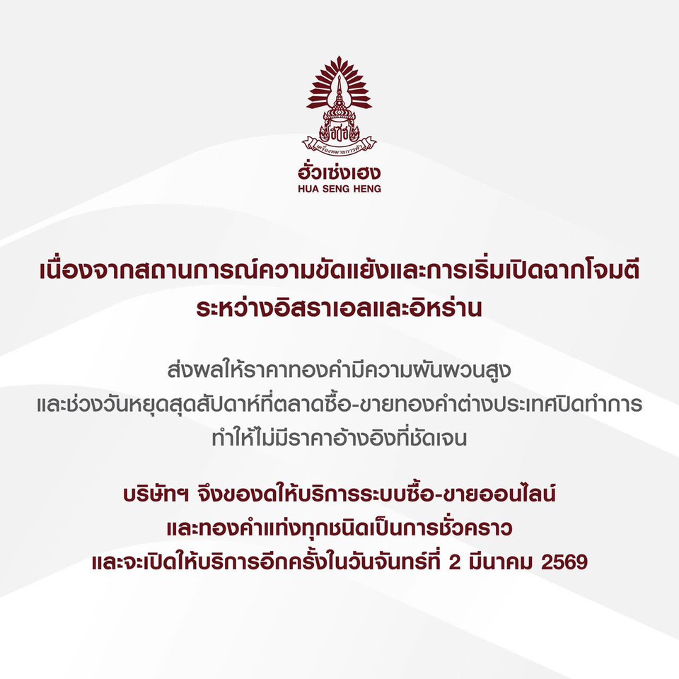 วันที่ 28 ก.พ.69 เพจ HSHsocial ฮั่วเซ่งเฮง โพสต์ประกาศระบุว่า เนื่องจากสถานการณ์ความขัดแย้งและการเริ่มเปิดฉากโจมตีระหว่างอิสราเอลและอิหร่าน ส่งผลให้ราคาทองคำมีความผันผวนสูง และช่วงวันหยุดสุดสัปดาห์ที่ตลาดซื้อ-ขายทองคำต่างประเทศปิดทำการ ทำให้ไม่มีราคาอ้างอิงที่ชัดเจน
