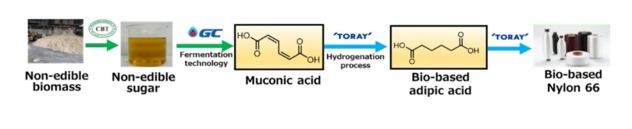 ด้วยความเชี่ยวชาญด้านเทคโนโลยีการหมักขั้นสูง GC สามารถแปลงน้ำตาลจากกากอ้อยและกากมันสำปะหลังให้เป็นกรดมิวโคนิกชีวภาพมูลค่าสูง ผสานเทคโนโลยีของ Toray Industries, Inc. ในการผลิตกรดอะดิปิกชีวภาพบริสุทธิ์สูง สำหรับการผลิตไนลอน-6,6 ที่เป็นมิตรต่อสิ่งแวดล้อม นวัตกรรมนี้สามารถต่อยอดสู่ผลิตภัณฑ์สิ่งทอ ชิ้นส่วนยานยนต์ และอุปกรณ์อิเล็กทรอนิกส์ โดยตั้งเป้าการผลิตเชิงพาณิชย์หลายพันตันต่อปี ภายในปี 2573