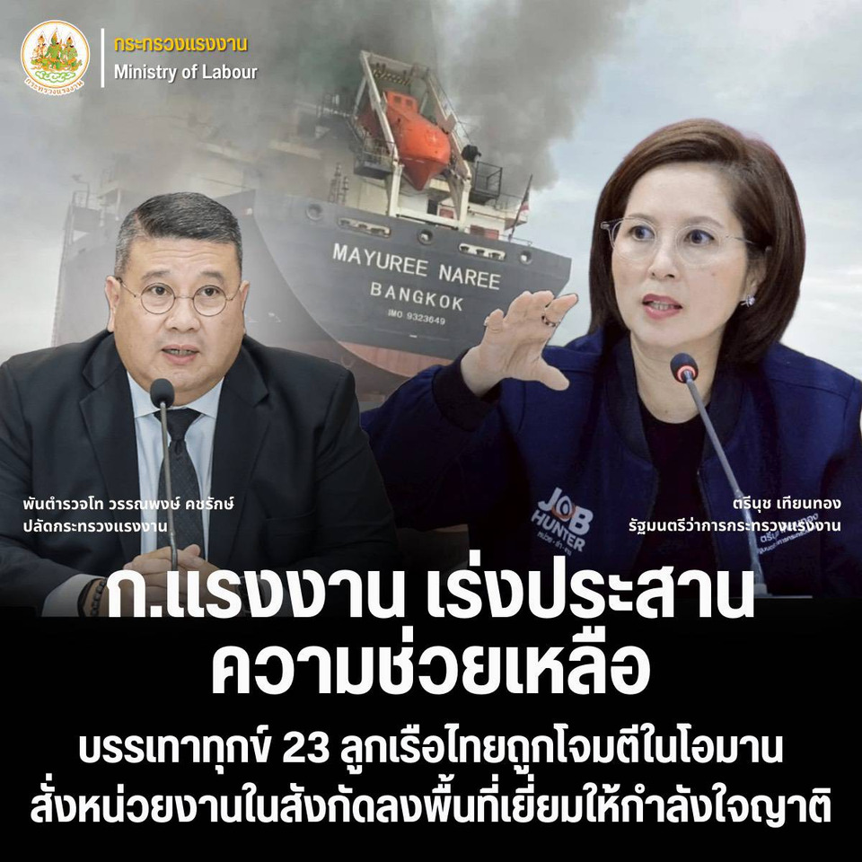 วันที่ 12 มีนาคม 2569 นายสันติ นันตสุวรรณ รองปลัดกระทรวงแรงงาน ในฐานะโฆษกกระทรวงแรงงาน เปิดเผยถึงความคืบหน้าการให้ความช่วยเหลือแรงงานไทยกรณีเหตุการณ์เรือสินค้า “มยุรี นารี” ของไทย ถูกโจมตีใกล้ช่องแคบฮอร์มุซ เมื่อช่วงเช้าวันที่ 11 มีนาคมที่ผ่านมาว่า มาตรการความช่วยเหลืงของกระทรวงแรงงาน จากรายงานของอัครราชทูตที่ปรึกษาฝ่ายแรงงาน ประจำสถานเอกอัครราชทูต ณ กรุงอาบูดาบี ระบุว่า เรือลำดังกล่าวมีลูกเรือทั้งหมด 23 คน ส่วนใหญ่เป็นคนไทย จำเป็นต้องสละเรือและขึ้นเรือชูชีพ โดยลูกเรือจำนวน 20 คน ได้รับการช่วยเหลือโดยกองทัพเรือโอมาน และนำขึ้นฝั่งที่ Khasab อย่างปลอดภัยแล้ว ปัจจุบันพักอยู่ ณ โรงแรมที่บริษัทจัดหาให้ โดยสถานเอกอัครราชทูต ณ กรุงมัสกัต อยู่ระหว่างประสานกระทรวงการต่างประเทศโอมานเพื่อเข้าเยี่ยม