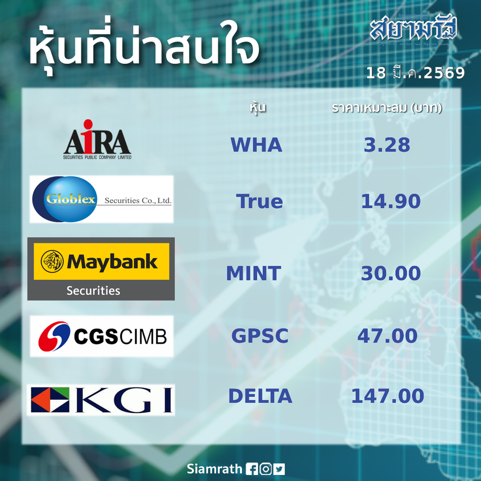 ข่าวเศรษฐกิจรู้ก่อนรวยก่อน ส่อง 5 หุ้น น่าสนใจ 18/03/69แชร์ข่าววันที่ 18 มี.ค.2569 ส่องกล้องมองตลาดหุ้นไทยตัวไหนน่าลงทุนประจำวันที่ 18 มีนาคม 2569 โต๊ะเศรษฐกิจสยามรัฐอินไซด์ ข่าวแนะนำโปรดทราบ! "ไอซ์ ปรีชญา" ตอบกลับคอมเมนต์ชาวเน็ต หลังถามถึง AI สร้างแอพอะไร!บันเทิงไอซ์ ปรีชญา ตอบคำถามชาวเน็ตเกี่ยวกับ AI หลังถามถึงแอพสร้างภาพ ติดตามคำตอบของเธอ"กบน." ปรับเรตหั่นอุดหนุนดีเซล อัดฉีด "E20-E85" เต็มสูบข่าวเศรษฐกิจกบน. ปรับเงินอุดหนุนดีเซลลดลง และเพิ่มการอุดหนุนแก๊สโซฮอล์ E20 และ E85 เต็มสูบ "UN" เตือน! โลกเผชิญวิกฤตหิวโหยเพิ่มอีก 45 ล้านคน หากสงครามตะวันออกกลางยืดเยื้อต่างประเทศ"UN เตือนวิกฤตหิวโหยเพิ่มขึ้นอีกหลายสิบล้านคน ผลกระทบจากการปิดกั้นช่องแคบฮอร์มุซหัวจะปวด! คนกระโดดลงบ่อ 'หมูเด้ง' โชคดีไม่โดนกัด ไม่ใช่ทุกคนจะลงได้โซเชียลคนกระโดดลงบ่อ 'หมูเด้ง' โชคดีไม่โดนกัด เจ้าหน้าที่ย้ำไม่ใช่ทุกคนจะลงไปได้Tags:ตลาดหุ้นราคาหุ้นราคาหุ้นวันนี้แชร์ข่าวข่าวที่เกี่ยวข้องต่างประเทศประเด็นข่าวรอบโลก : "อิสราเอล"ทำการโจมตีทางอากาศถล่มกรุงเบรุต / "สหรัฐฯ" โจมตีฐานขีปนาวุธของอิหร่าน - ทรัมป์ ทวงบุญคุณ "นาโต"ต่างประเทศ"หุ้นฮ่องกง" สดใส! "ฮั่งเส็ง" เปิดบวก 54.49 จุด ข้อมูลเศรษฐกิจจีนแกร่งหนุนตลาดต่อเนื่องข่าวเศรษฐกิจหุ้นดาวโจนส์ ประจำวันที่ 17/03/69 เพิ่มขึ้น 46.85 จุด รับหุ้นสายการบิน-ธุรกิจท่องเที่ยวฟื้น