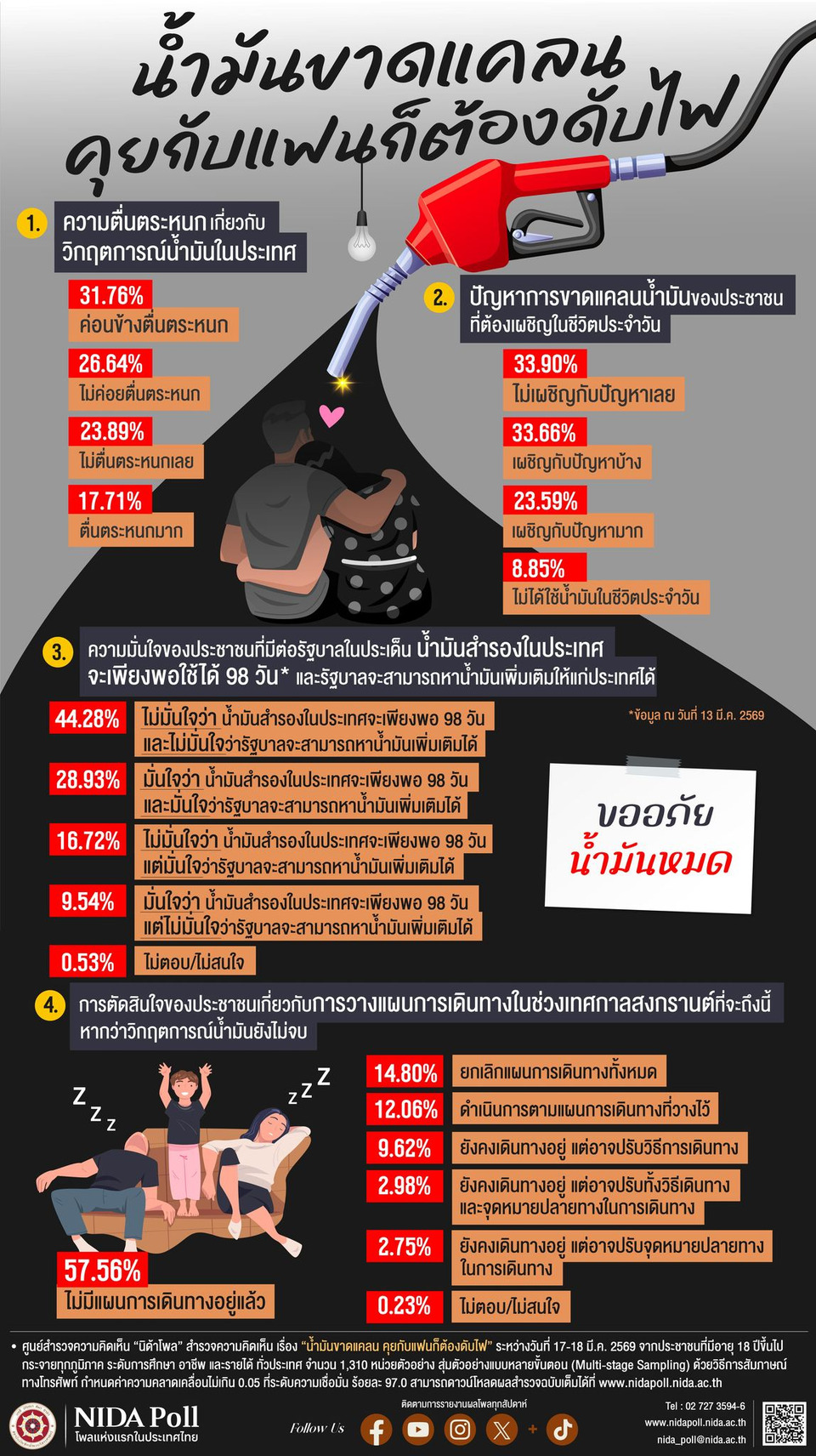 วันที่ 22 มีนาคม 2569 ศูนย์สำรวจความคิดเห็น "นิด้าโพล" สถาบันบัณฑิตพัฒนบริหารศาสตร์ (นิด้า) เปิดเผยผลการสำรวจ เรื่อง "น้ำมันขาดแคลน คุยกับแฟนก็ต้องดับไฟ" ทำการสำรวจระหว่างวันที่ 17 - 18 มีนาคม 2569 จากประชาชนที่มีอายุ 18 ปีขึ้นไป กระจายทุกภูมิภาค ระดับการศึกษา อาชีพ และรายได้ ทั่วประเทศ รวมจำนวนทั้งสิ้น 1,310 หน่วยตัวอย่าง เกี่ยวกับวิกฤตการณ์น้ำมันในประเทศ การสำรวจอาศัยการสุ่มตัวอย่างโดยใช้ความน่าจะเป็น จากบัญชีรายชื่อฐานข้อมูลตัวอย่างหลัก (Master Sample) ของ "นิด้าโพล" สุ่มตัวอย่างแบบหลายขั้นตอน (Multi-stage Sampling) เก็บข้อมูลด้วยวิธีการสัมภาษณ์ทางโทรศัพท์ โดยกำหนดค่าความคลาดเคลื่อนไม่เกิน 0.05 ที่ระดับความเชื่อมั่น ร้อยละ 97.0