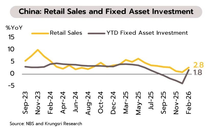 จีน: มาตรการกระตุ้นเป็นกุญแจช่วยพยุงเศรษฐกิจ แม้การบริโภคภายในประเทศได้แรงหนุนจากเทศกาลตรุษจีน แต่โดยพื้นฐานยังอ่อนแอ ส่วนหนึ่งเป็นผลจากวิกฤตอสังหาริมทรัพย์ที่ยังไม่มีแนวโน้มดีขึ้น โดยราคาบ้านยังหดตัวต่อเนื่องนาน 4 ปี ในระยะข้างหน้า ความหวังในการพลิกฟื้นเศรษฐกิจจึงอยู่ที่นโยบายของรัฐบาล อาทิ การอุดหนุนการแลกซื้อสินค้าใหม่ การสร้างหลักประกันทางรายได้และสังคม รวมถึงการลงทุนในโครงสร้างพื้นฐาน ซึ่งขยายตัวถึง 11.4% ในช่วงสองเดือนแรก