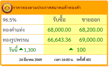 วันที่ 24 มี.ค.69 สมาคมค้าทองคำประกาศราคาทอง วันนี้ (24 มี.ค.2569) ประกาศครั้งที่ 45 เวลา 16.00 น. ปรับขึ้น 100 บาท โดยมีรายละเอียดดังนี้