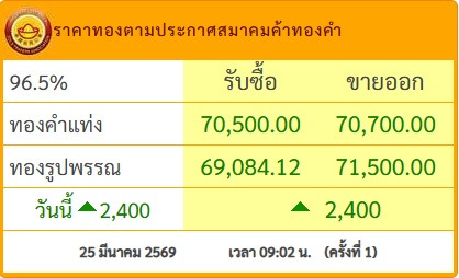 วันที่ 25 มี.ค.69 สมาคมค้าทองคำประกาศราคาทอง วันนี้ (25 มี.ค.2569) ประกาศครั้งที่ 1 เวลา 09.02 น. พุ่ง 2,400 บาท โดยมีรายละเอียดดังนี้