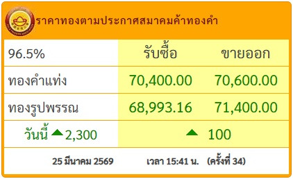 วันที่ 25 มี.ค.69 สมาคมค้าทองคำประกาศราคาทอง วันนี้ (25 มี.ค.2569) ประกาศครั้งที่ 34 เวลา 15.41 น. ปรับขึ้น 100 บาท โดยมีรายละเอียดดังนี้