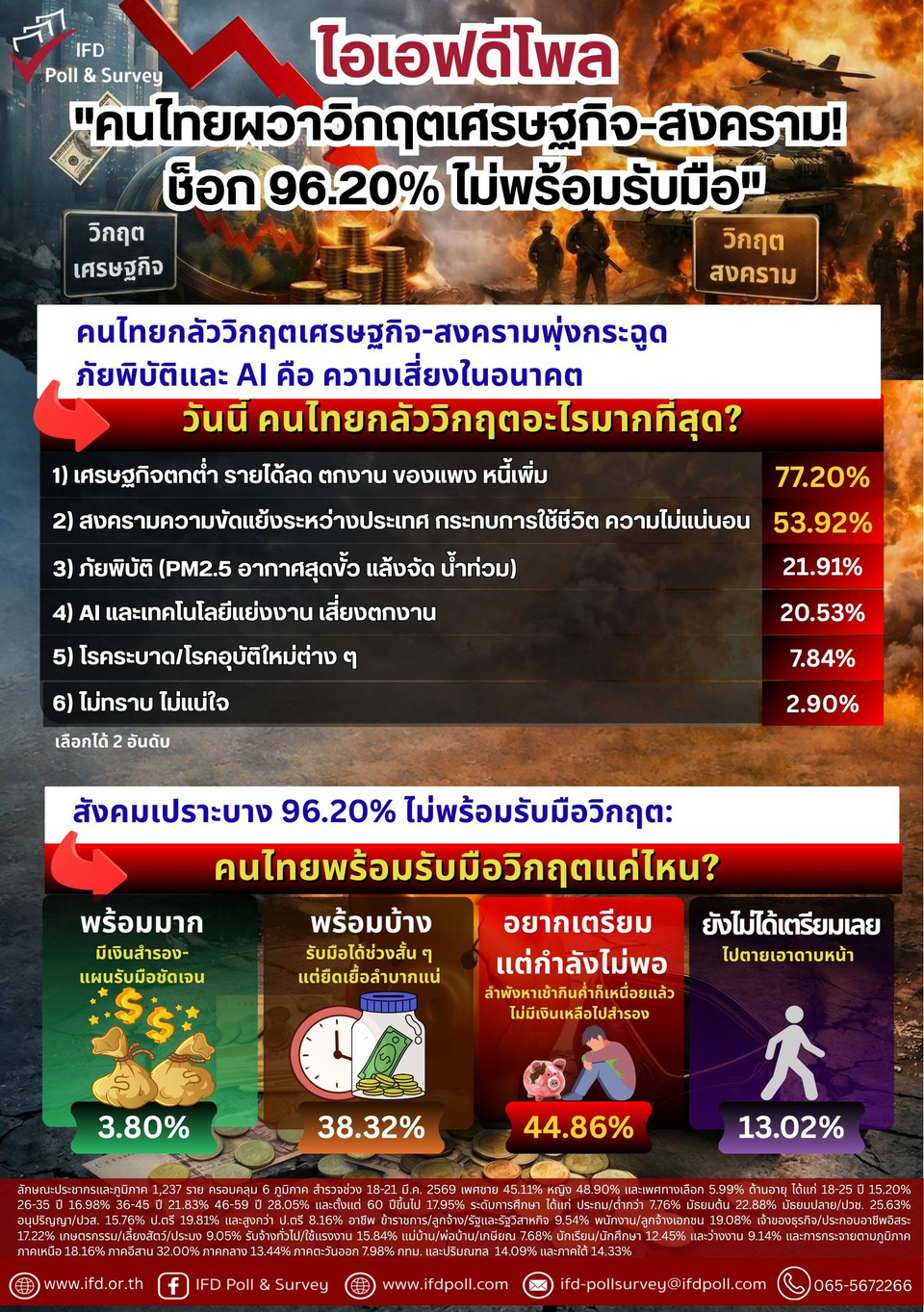 เมื่อวันที่ 25 มี.ค. 2569 ไอเอฟดีโพลและเซอร์เวย์ โดย ศ.ดร.เกรียงศักดิ์ เจริญวงศ์ศักดิ์ (ดร.แดน) ประธานสถาบันการสร้างชาติ ประธานสถาบันอนาคตศึกษาเพื่อการพัฒนา และนางจิตติมา บุญวิทยา ผู้อำนวยการไอเอฟดีโพลและเซอร์เวย์ แถลงผลสำรวจความคิดเห็น เรื่อง "คนไทยผวาวิกฤตเศรษฐกิจ-สงคราม! ช็อก 96.20% ไม่พร้อมรับมือ" กลุ่มตัวอย่าง 1,237 ราย สำรวจช่วง 18-21 มี.ค. 2569 ครอบคลุม 6 ภูมิภาค ค่าความเชื่อมั่น 95% ค่าคลาดเคลื่อน ±3%