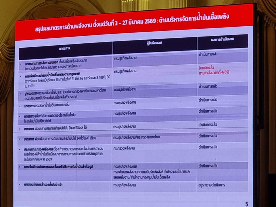 "ก.พลังงานยืนยันว่ามีน้ำมันเพียงพอ โดยได้ดำเนินมาตรการทันทีตั้งแต่เริ่มเกิดสถานการณ์ ได้แก่ การระงับการส่งออกน้ำมันไปประเทศเพื่อนบ้าน เพื่อให้มีน้ำมันใช้ในประเทศ การเพิ่มการสำรองน้ำมันตามกฎหมาย และต่อมาปรับมาใช้รองรับความต้องการในประเทศที่เพิ่มขึ้น รวมถึงการตรวจสอบสต๊อกน้ำมันของผู้ค้าอย่างเข้มงวด"