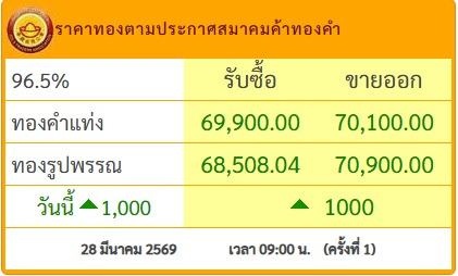 วันที่ 29 มี.ค.69 ราคาทองตามประกาศสมาคมค้าทองคำ(ปิดทำการ) ซึ่งปิดตลาดทองคำ เมื่อวันเสาร์ที่ 28 มีนาคม 2569 ประกาศครั้งที่ 1 เมื่อเวลา 09:00น. ปรับขึ้นแรง 1,000 บาท โดยมีรายละเอียดดังนี้