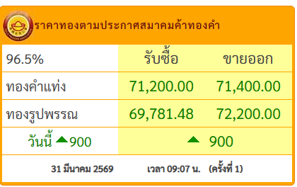 วันที่ 31 มี.ค.69 สมาคมค้าทองคำประกาศราคาทอง วันนี้ (31 มี.ค.2569) ประกาศครั้งที่ 1 เวลา 09.07 น.ปรับขึ้น 900 บาท โดยมีรายละเอียดดังนี้