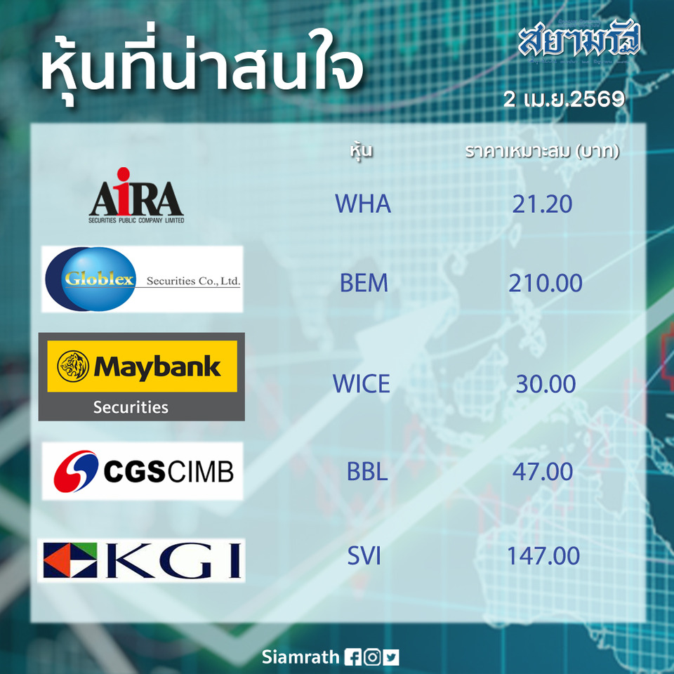 ข่าวเศรษฐกิจรู้ก่อนรวยก่อน ส่อง 5 หุ้น น่าสนใจ 02/04/69แชร์ข่าววันที่ 2 เม.ย.2569 ส่องกล้องมองตลาดหุ้นไทยตัวไหนน่าลงทุนประจำวันที่ 2 เมษายน 2569 โต๊ะเศรษฐกิจสยามรัฐอินไซด์ ข่าวแนะนำ“อิ๊งค์-สามี” เยี่ยม “ทักษิณ” ครั้งที่ 53 หลังมติคณะกรรมการพักโทษผ่านฉลุยการเมืองทั่วไป"ปกรณ์" รองนายกฯ ป้ายแดง เผยเหตุร่วม "ครม.หนู 2" ย้ำขอทำงานเพื่อประเทศชาติ ไม่ยุ่งการเมือง-ไม่สนับสนุนการฮั้วการเมืองทั่วไป"ปกรณ์" รองนายกฯ ป้ายแดง เผยเหตุร่วม "ครม.หนู 2" ย้ำขอทำงานเพื่อประเทศชาติ ไม่ยุ่งการเมือง-ไม่สนับสนรองผู้ว่าฯ ตรัง ลงพื้นที่ตลาดห้องเย็นควนปริง ติดตามสถานการณ์ราคาสินค้า หลังน้ำมันขึ้นข่าวภูมิภาคยื่นร่าง พรบ.เกณฑ์ทหารแบบสมัครใจ เดินหน้าหยุดซ้อมทรมาน เอาเปรียบ-หักหัวคิวในค่ายการเมืองทั่วไปTags:ตลาดหุ้นราคาหุ้นราคาหุ้นวันนี้แชร์ข่าวข่าวที่เกี่ยวข้องข่าวเศรษฐกิจน้ำมันดิบเวสต์เทกซัส วันที่ 01/04/69 ลดลง 1.26 ดอลลาร์ หลังทรัมป์สัญญายุติความขัดแย้งตะวันออกกลางข่าวเศรษฐกิจหุ้นดาวโจนส์ ประจำวันที่ 01/04/69 ปิดบวก 224.23 จุด หลังทรัมป์สัญญายุติความขัดแย้งตะวันออกกลางข่าวเศรษฐกิจรู้ก่อนรวยก่อน ส่อง 5 หุ้น น่าสนใจ 01/04/69