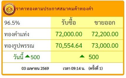 วันที่ 3 เม.ย.69 สมาคมค้าทองคำประกาศราคาทอง วันนี้ (3 เม.ย.2569) ประกาศครั้งที่ 1 เมื่อเวลา 09.14 น.ปรับขึ้น 500 บาท ล่าสุด เมื่อเวลา 16.08 น.ยังคงที่ โดยมีรายละเอียดดังนี้