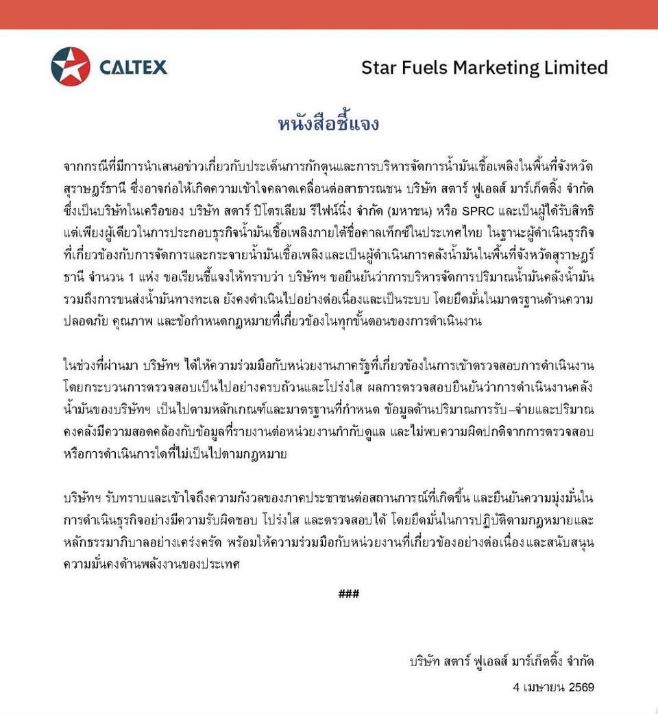 วันที่ 4 เม.ย.69 จากกรณีที่มีการนำเสนอข่าวเกี่ยวกับประเด็นการกักตุนและการบริหารจัดการน้ำมันเชื้อเพลิงในพื้นที่จังหวัด สุราษฎร์ธานี ซึ่งอาจก่อให้เกิดความเข้าใจคลาดเคลื่อนต่อสาธารณชน บริษัท สตาร์ ฟูเอลส์ มาร์เก็ตติ้ง จำกัด ซึ่งเป็นบริษัทในเครือของ บริษัท สตาร์ ปิโตรเลียม รีไฟน์นิ่ง จำกัด (มหาชน) หรือ SPRC และเป็นผู้ได้รับสิทธิแต่เพียงผู้เดียวในการประกอบธุรกิจน้ำมันเชื้อเพลิงภายใต้ชื่อคาลเท็กซ์ในประเทศไทย ในฐานะผู้ดำเนินธุรกิจที่เกี่ยวข้องกับการจัดการและกระจายน้ำมันเชื้อเพลิงและเป็นผู้ดำเนินการคลังน้ำมันในพื้นที่จังหวัดสุราษฎร์ธานี จำนวน 1 แห่ง ขอเรียนชี้แจงให้ทราบว่า บริษัทฯ ขอยืนยันว่าการบริหารจัดการปริมาณน้ำมันคลังน้ำมัน รวมถึงการขนส่งน้ำมันทางทะเล ยังคงดำเนินไปอย่างต่อเนื่องและเป็นระบบ โดยยึดมั่นในมาตรฐานด้านความปลอดภัย คุณภาพ และข้อกำหนดกฎหมายที่เกี่ยวข้องในทุกขั้นตอนของการดำเนินงาน