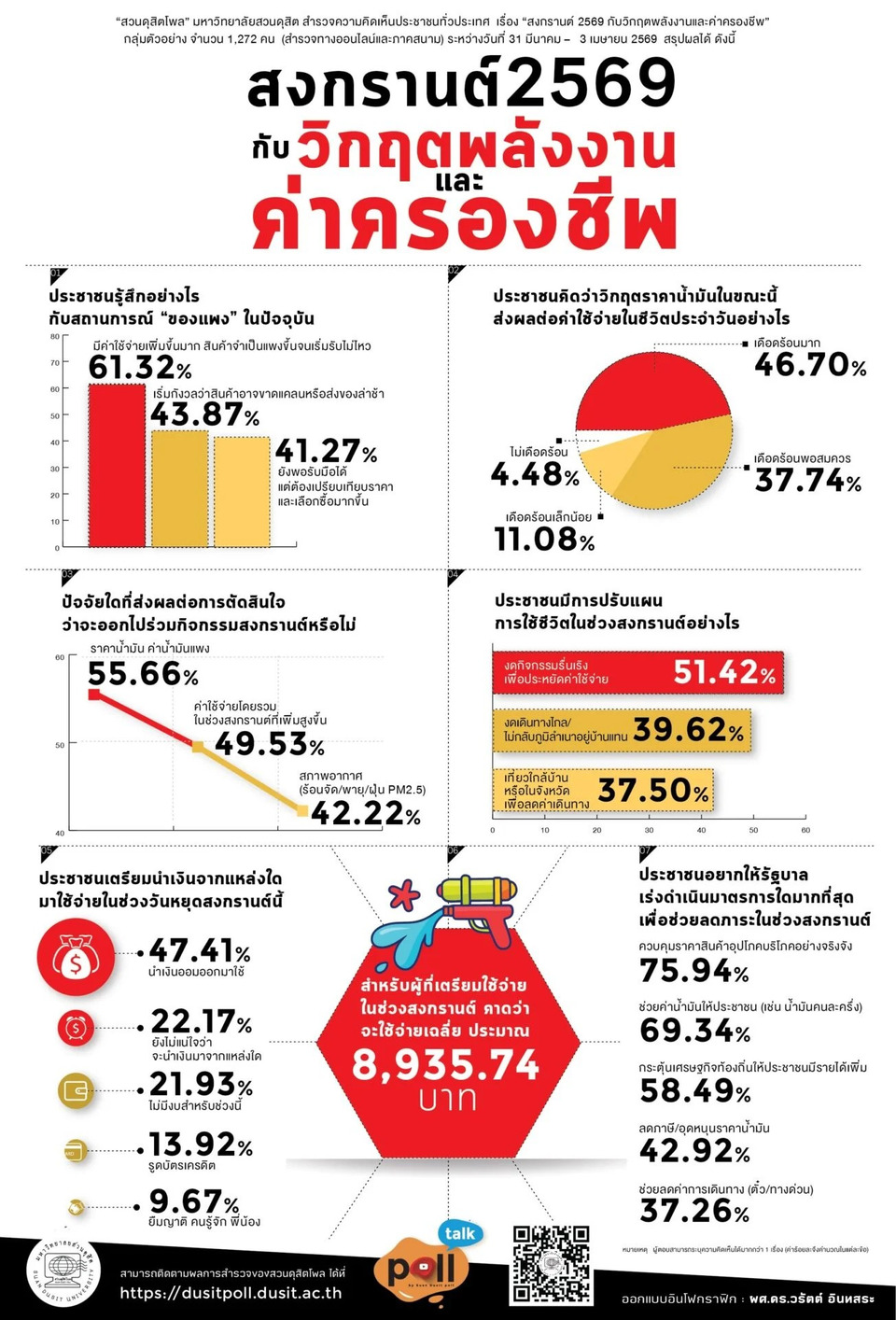 เมื่อวันที่ 5 เม.ย.69 “สวนดุสิตโพล” มหาวิทยาลัยสวนดุสิต สำรวจความคิดเห็นประชาชนทั่วประเทศ เรื่อง “สงกรานต์ 2569 กับวิกฤตพลังงานและค่าครองชีพ” กลุ่มตัวอย่างจำนวน 1,272 คน (สำรวจทางออนไลน์และภาคสนาม) ระหว่างวันที่ 31 มีนาคม– 3 เมษายน 2569 ผลการสำรวจ พบว่า จากสถานการณ์ของแพง กลุ่มตัวอย่างรู้สึกว่ามีค่าใช้จ่ายเพิ่มขึ้นมาก โดยเฉพาะสินค้าจำเป็นที่แพงขึ้นจนเริ่มรับไม่ไหว ร้อยละ 61.32 และวิกฤตราคาน้ำมันในขณะนี้ส่งผลให้เดือดร้อนมาก ร้อยละ 46.70 สำหรับปัจจัยที่เกี่ยวข้องกับการตัดสินใจออกไปร่วมกิจกรรมสงกรานต์ คือ ราคาน้ำมัน ร้อยละ 55.66 โดยมีการปรับแผนการใช้ชีวิตในช่วงสงกรานต์ด้วยการงดกิจกรรมรื่นเริงเพื่อประหยัดค่าใช้จ่าย ร้อยละ 51.42 ในช่วงวันหยุดสงกรานต์นี้กลุ่มตัวอย่างเตรียมนำเงินออมออกมาใช้มากที่สุด ร้อยละ 47.41 คาดว่าจะมีค่าใช้จ่ายเฉลี่ยประมาณ 8,935.74 บาท ทั้งนี้กลุ่มตัวอย่างอยากให้รัฐบาลเร่งดำเนินการควบคุมราคาสินค้าอุปโภคบริโภคอย่างจริงจัง เพื่อช่วยลดภาระค่าใช้จ่ายในช่วงสงกรานต์ ร้อยละ 75.94