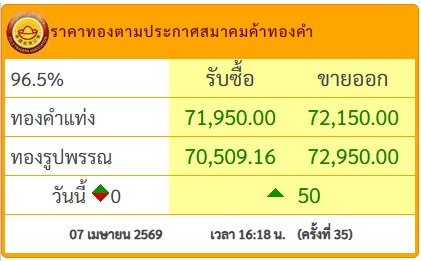 วันที่ 7 เม.ย.69 สมาคมค้าทองคำประกาศราคาทอง วันนี้ (7 เม.ย.2569) ประกาศครั้งที่ 35 เมื่อเวลา 16.18 น. ปรับขึ้น 50 บาท โดยมีรายละเอียดดังนี้