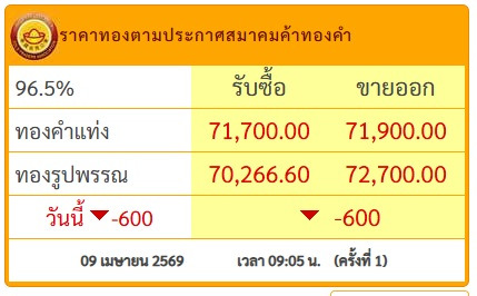 วันที่ 9 เม.ย.69 สมาคมค้าทองคำประกาศราคาทอง วันนี้ (9 เม.ย.2569) เปิดตลาด เมื่อเวลา 09.05 น. ร่วง 600 บาท บาท โดยมีรายละเอียดดังนี้
