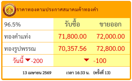 วันที่ 13 เม.ย.69 สมาคมค้าทองคำประกาศราคาทอง วันนี้ (13 เม.ย.2569) ประกาศครั้งที่ 13 เมื่อเวลา 16.33 น.ปรับลง 100 บาท โดยมีรายละเอียดดังนี้