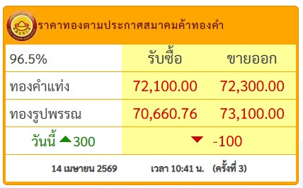 วันที่ 14 เม.ย.69 สมาคมค้าทองคำประกาศราคาทอง วันนี้ (14 เม.ย.2569) ประกาศครั้งที่ 3 เมื่อเวลา 10.41 น.ปรับลง 100 บาท โดยมีรายละเอียดดังนี้