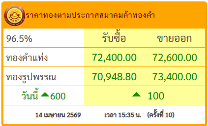 วันที่ 14 เม.ย.69 สมาคมค้าทองคำประกาศราคาทอง วันนี้ (14 เม.ย.2569) ประกาศครั้งที่ 10 เมื่อเวลา 15.35 น.ปรับขึ้น 100 บาทโดยมีรายละเอียดดังนี้