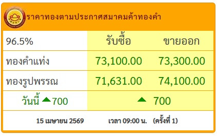 วันที่ 15 เม.ย.69 สมาคมค้าทองคำประกาศราคาทอง วันนี้ (15 เม.ย.2569) ประกาศครั้งที่ 1 เมื่อเวลา 09.00 น.ปรับขึ้น 700 บาท โดยมีรายละเอียดดังนี้