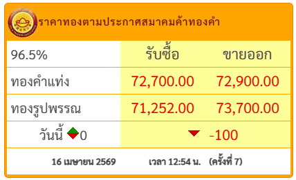 วันที่ 16 เม.ย.69 สมาคมค้าทองคำประกาศราคาทอง วันนี้ (16 เม.ย.2569) ประกาศครั้งที่ 7 เมื่อเวลา 12.54 น.ปรับลง 100 บาท โดยมีรายละเอียดดังนี้