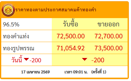 วันที่ 17 เม.ย.69 สมาคมค้าทองคำประกาศราคาทอง วันนี้ (17 เม.ย.2569) ประกาศครั้งที่ 1 เมื่อเวลา 09.01 น.ปรับลง 200 บาท โดยมีรายละเอียดดังนี้