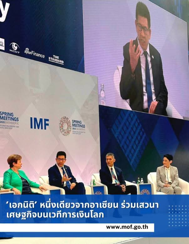 ดร.เอกนิติ นิติทัณฑ์ประภาศ รองนายกรัฐมนตรีและรัฐมนตรีว่าการกระทรวงการคลัง ร่วมเสวนาเศรษฐกิจโลก “The Debate on the Global Economy” พร้อมกับ Dr. Kristalina Georgieva กรรมการจัดการกองทุนการเงินระหว่างประเทศ นาย Mohammed Al-Jadaan รัฐมนตรีว่าการกระทรวงการคลังซาอุดีอาระเบีย นาย François Villeroy ผู้ว่าการธนาคารกลางฝรั่งเศส Dr. Eswar Prasad ศาสตราจารย์อาวุโสด้านนโยบายการค้าและเศรษฐศาสตร์ Cornell University และ นาง Martina Cheung ประธาน ประธานเจ้าหน้าที่บริหาร และคณะกรรมการบริษัท S&P Global ซึ่งเป็นเวทีหลัก ในการประชุมสภาผู้ว่าการธนาคารโลกและกองทุนการเงินระหว่างประเทศ ปี 2569 ณ กรุงวอชิงตัน ดี.ซี. สหรัฐอเมริกา เมื่อวันที่ 16 เมษายน 2569