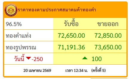 วันที่ 20 เม.ย.69 สมาคมค้าทองคำประกาศราคาทอง วันนี้ (20 เม.ย.2569) ประกาศครั้งที่ 5 เมื่อเวลา 12.34 น.ปรับขึ้น 100 บาท โดยมีรายละเอียดดังนี้