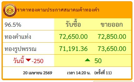 วันที่ 20 เม.ย.69 สมาคมค้าทองคำประกาศราคาทอง วันนี้ (20 เม.ย.2569) ประกาศครั้งที่ 11 เมื่อเวลา 14.20 น.ปรับขึ้น 50 บาท โดยมีรายละเอียดดังนี้