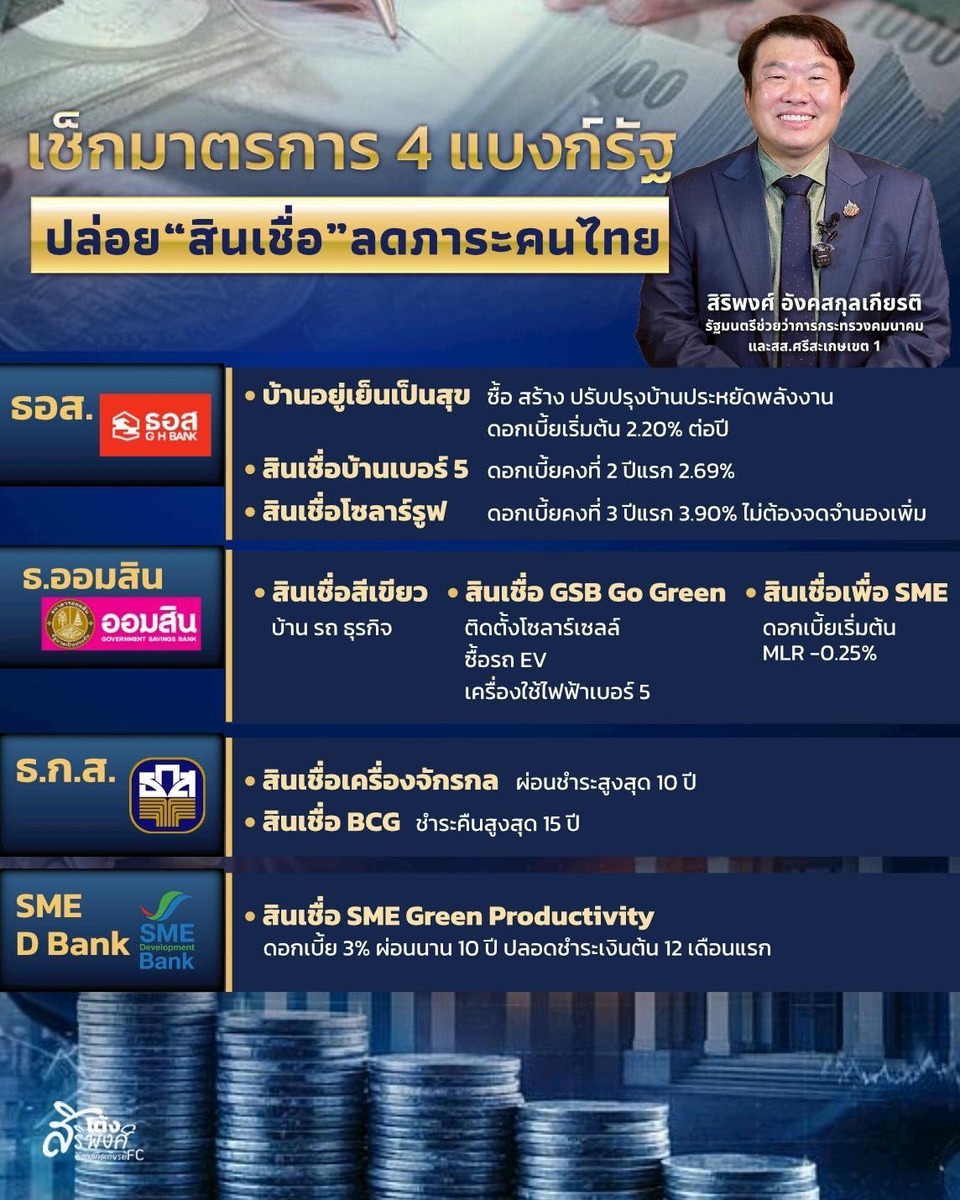 วันที่ 17 เมษายน 2569 นายสิริพงศ์ อังคสกุลเกียรติ รัฐมนตรีช่วยว่าการกระทรวงคมนาคม และ ส.ส. ศรีสะเกษ เขต 1 โพสต์เฟซบุ๊กระบุข้อความว่า เช็กมาตรการ 4 แบงก์รัฐปล่อย“สินเชื่อ”ลดภาระคนไทย