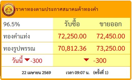 วันที่ 22 เม.ย.69 สมาคมค้าทองคำประกาศราคาทอง วันนี้ (22 เม.ย.2569) ประกาศครั้งที่ 1 เมื่อเวลา 09.07 น.ปรับลง 300 บาท โดยมีรายละเอียดดังนี้