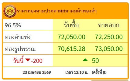 วันที่ 23 เม.ย.69 สมาคมค้าทองคำประกาศราคาทอง วันนี้ (23 เม.ย.2569) ประกาศครั้งที่ 8 เมื่อเวลา 12.10 น.ปรับขึ้น 50 บาท โดยมีรายละเอียดดังนี้