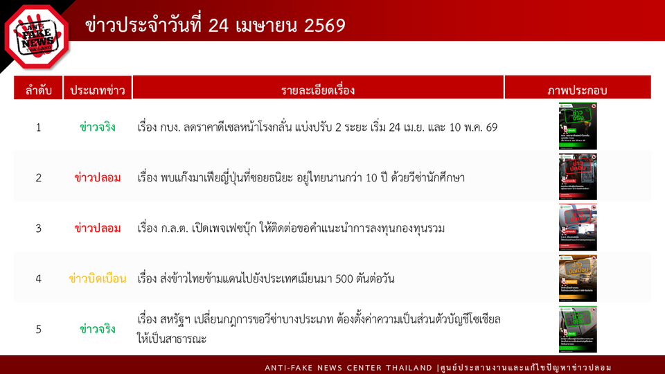 ทั้งนี้ ในวันที่ 24 เมษายน 2569 AFNC ได้ตรวจสอบพบข้อความทั้งหมด 161,237 ข้อความ โดยมีข้อความที่ต้องดำเนินการตรวจสอบ (Verify) ทั้งสิ้น 2,937 ข้อความ สำหรับช่องทางที่มีการพบเบาะแสมากที่สุด คือ ข้อความที่มาจาก Social Listening 2,935 ข้อความ ตามมาด้วยช่องทาง Line 2 ข้อความ โดยเป็นเรื่องที่ต้องดำเนินการตรวจสอบทั้งหมด 30 เรื่อง ได้รับผลการตรวจสอบจากหน่วยงานที่เกี่ยวข้องแล้ว 8 เรื่อง ในจำนวนนี้เป็นข่าวที่ได้รับความสนใจจากประชาชนมากที่สุด 7 เรื่อง ซึ่งเป็นข่าวจริง 2 เรื่อง ข่าวปลอม 4 เรื่อง ข่าวบิดเบือน 1 เรื่อง ได้แก่
