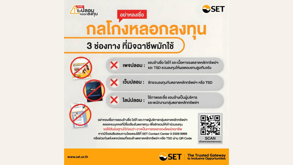 ตลาดหลักทรัพย์แห่งประเทศไทย (SET) แจ้งว่า ขณะนี้มีข่าวคนถูกมิจฉาชีพหลอกลงทุนมีมาให้เห็นกันอย่างต่อเนื่อง ขอย้ำว่าอย่าหลงเชื่อ! กลโกงมิจฉาชีพหลอกลงทุนไม่ว่าจะเป็น